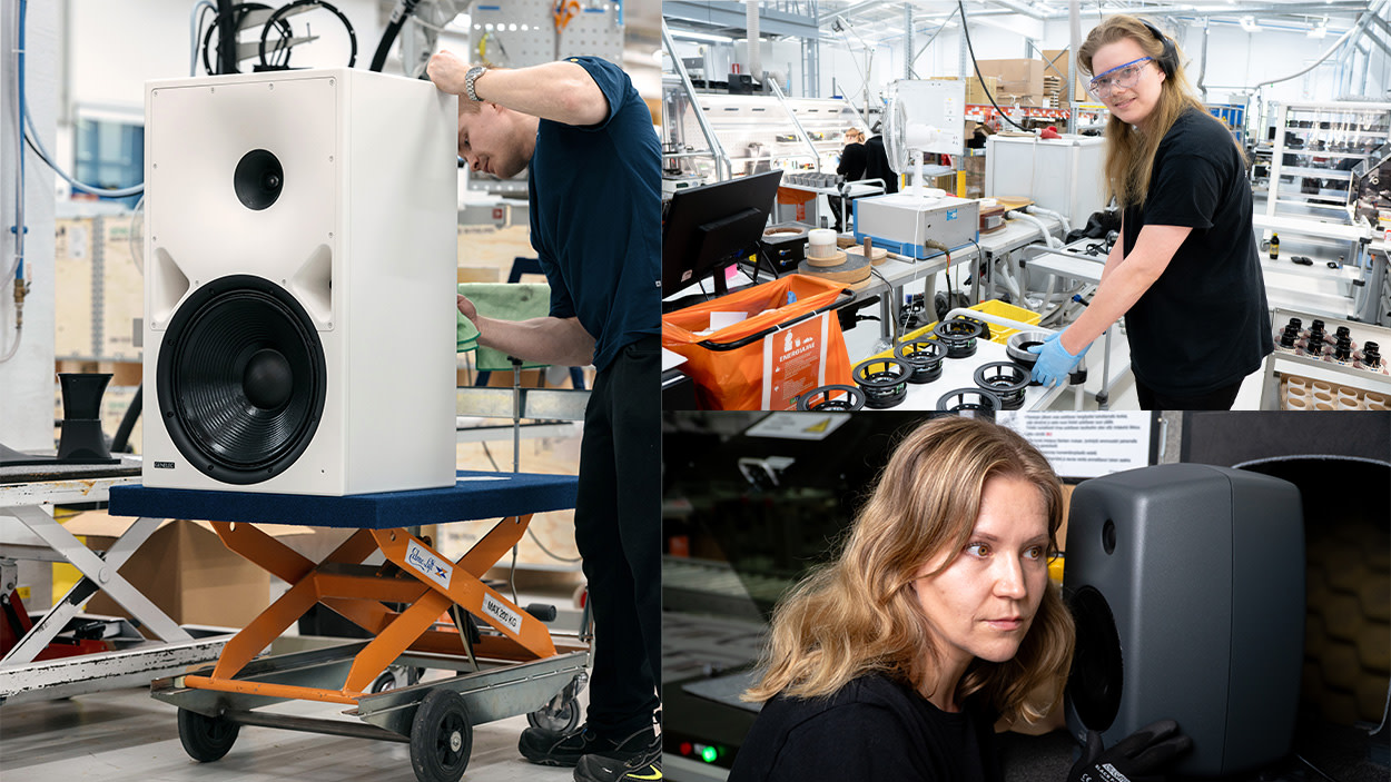 Pääkuva: Janne Hakala valmistelemassa uusinta Genelec-mallia, 8380A:ta, pakkaukseen, Santeri Moisanen elementtien valmistuksessa ja Sanna Juutinen testaamassa kaiuttimia.