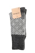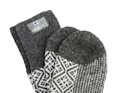 Suomessa valmistetut kirjoneulosvillasukat. Villasukan varressa Genelecin etiketti.
